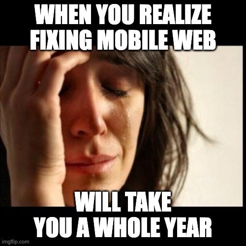 “Mobile traffic makes up 40/50/60% of all of our traffic. Conversion rate on desktop is 2x/3x/4x higher than on mobile. What did you fools break?! Fix it yesterday!!!”
